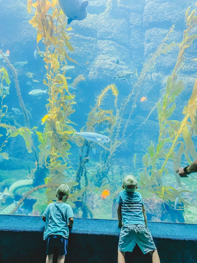 The touch pool at the back of the aquarium overlooks the rolling waves of La Jolla Shores. We loved touching the sting ray here! The shark tank is at the end of the aquarium outside. The tank is raised so you can see the sharks super clearly. My kids were mesmerized watching the leopard sharks swim about! This is also a good place for lunch.