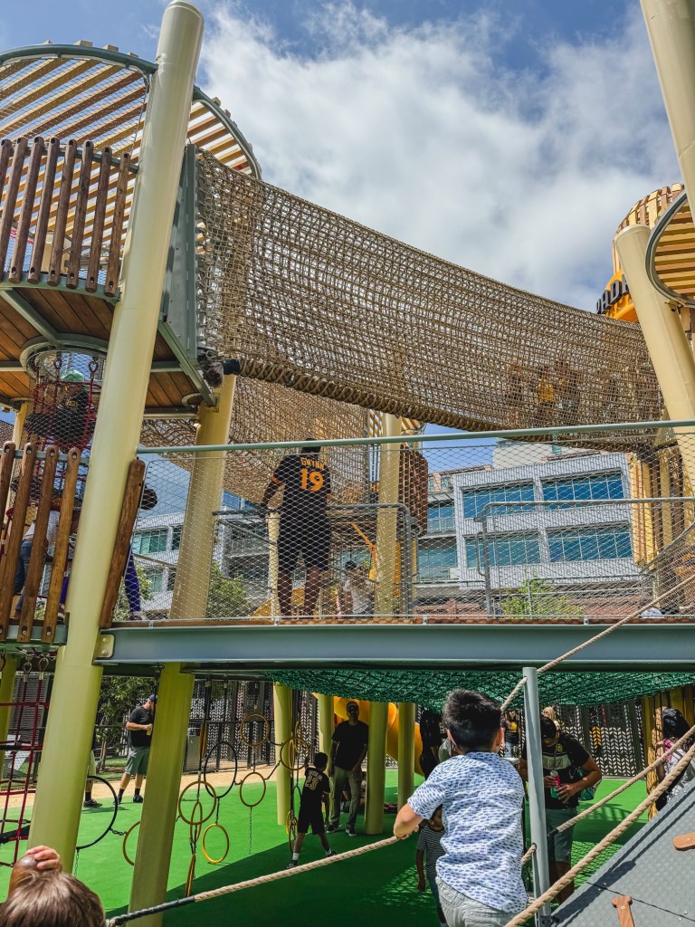 Let’s start with their new playground and kid’s area in Gallagher Square! This just opened this year in 2024 and it’s so fun! It’s behind the outfield so you can’t see the actual game from here, but a ticket here gets you access to the whole stadium. It’s fun to watch from the grassy fields plus the kids have space to move around.