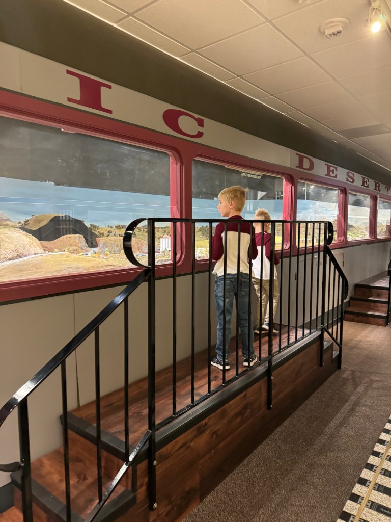 ‘The train runs 11-7 and it’s on the third level of the Westfield Escondido by the food court. It’s $4/ride or $20/6 rides. We always get the 6 ride card because we come here a lot!
